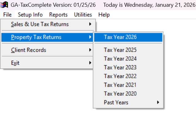 Select File > Property Tax Returns > Tax Year [2026] (or the latest tax year) will automatically trigger batch roll forward process