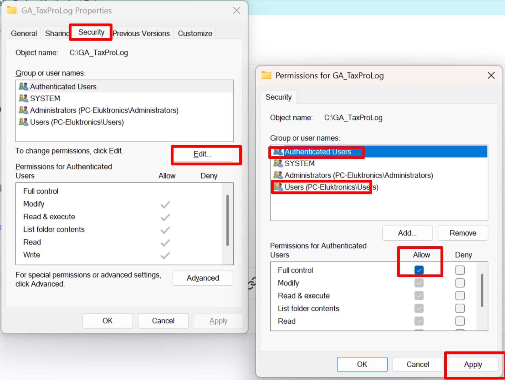 Once both folders have Full control permissions, you can re‑open GA‑Taxpro and continue using the application normally.