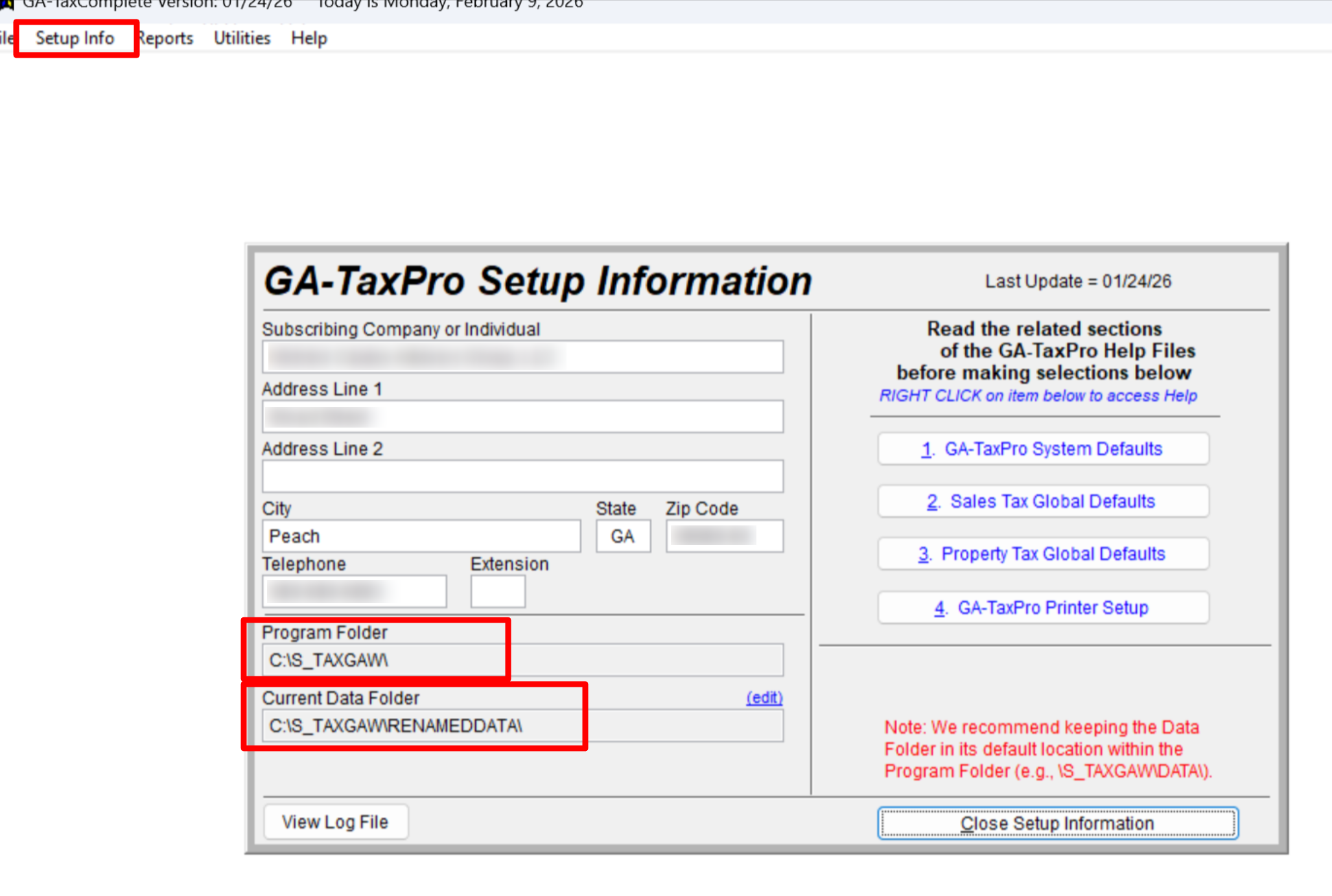 Open the GA‑Taxpro application, go to Setup Info, and note the paths for your Program Folder and Data Folder.