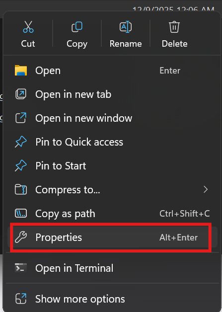 Right‑click the folder and choose Properties.