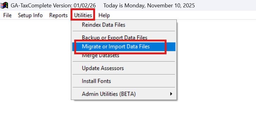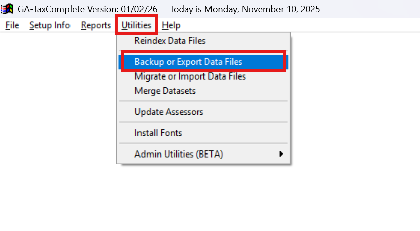 Note: In older versions of GA-TaxPro, this option may be found under Utilities > Backup Data.