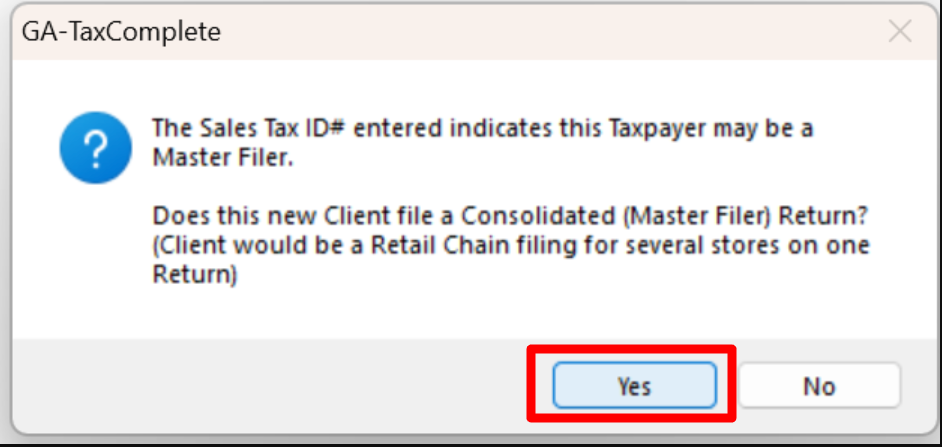 Select "Yes" when prompted if you are creating a Master Filer Return