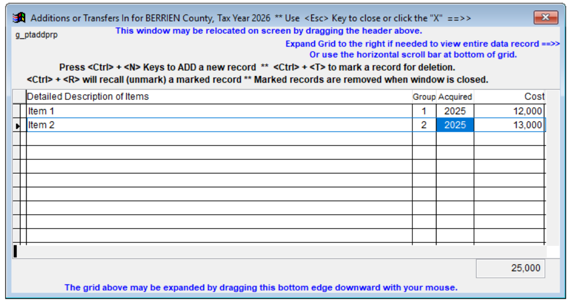 Fill in the required details for each addition, including Description, Group, Acquired Year, and Cost.
