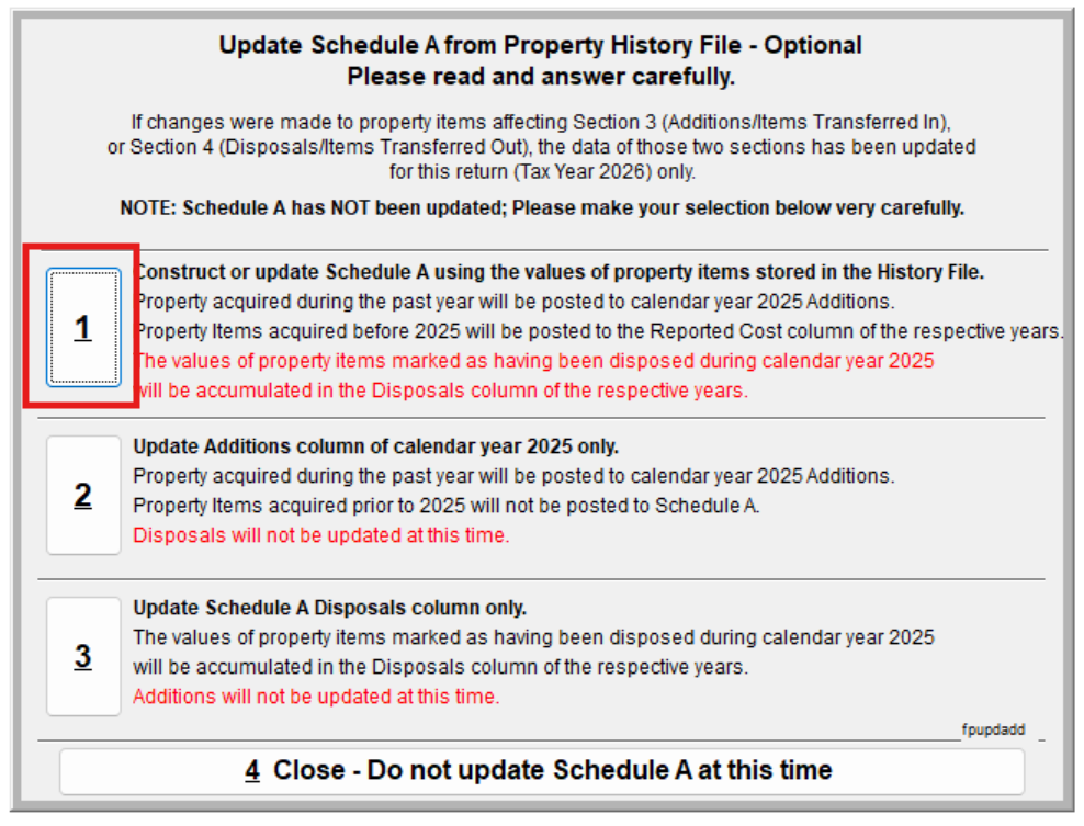 Select option 1 to fully rebuild Schedule A, then click Yes to confirm.