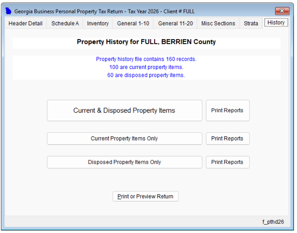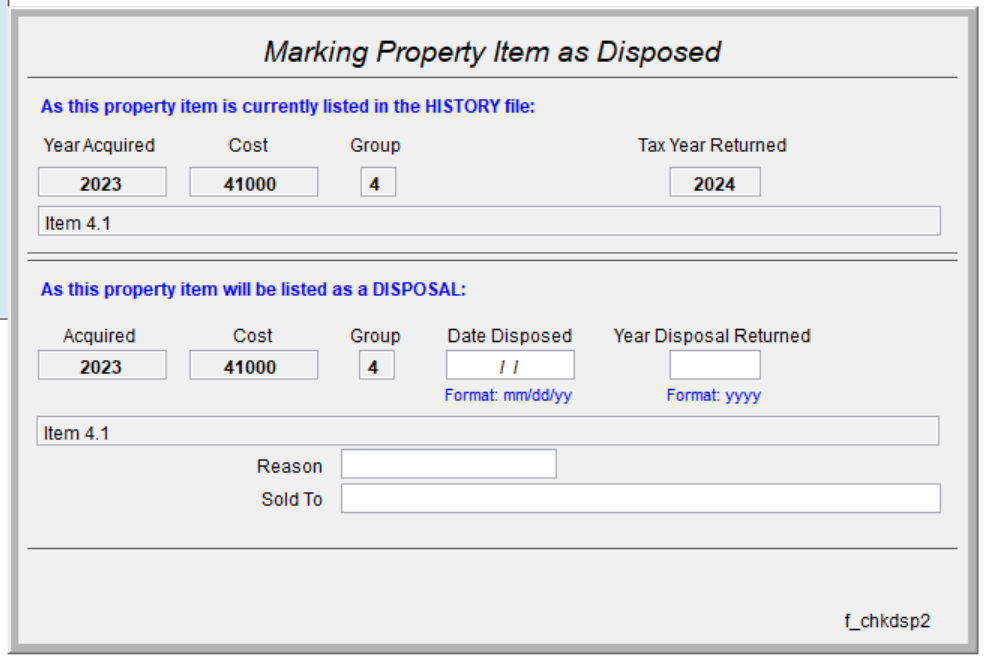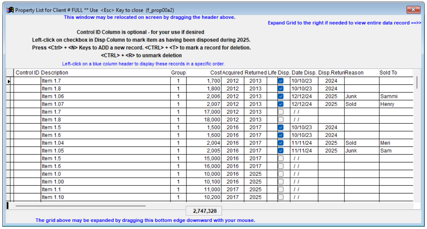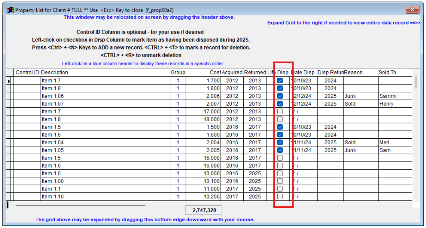 To dispose of a property, check the box under the Disp. (Disposal) column for that item.