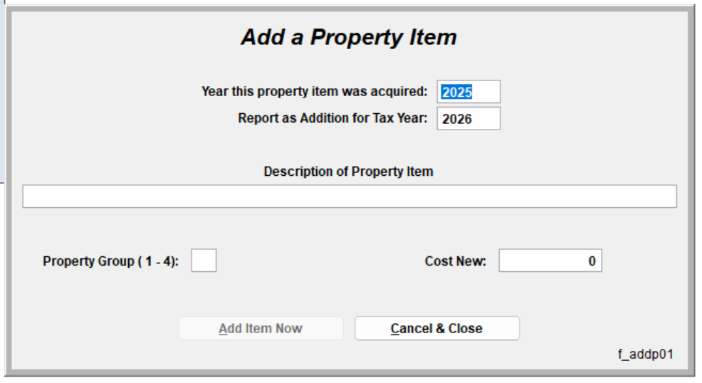 When adding a new property item, a pop-up will appear. Fill in all required fields, including: Year Acquired, Report as Tax Year (Returned), Description, Group, Cost